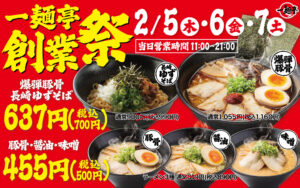 \年に一度のお得な3日間!/一麺亭「創業祭」開催します! 日頃のご愛顧に感謝を込めて、 期間中は、大人気のラーメン5種類が創業祭だけの特別価格で味わえます♪ ─...